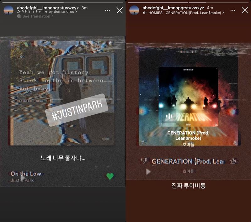 지난 16일 정국은 자신의 인스타그램 스토리 하이라이트에 요즘 즐겨 듣는 곡으로 추측되는 노래 영상 2개를 업로드했다.