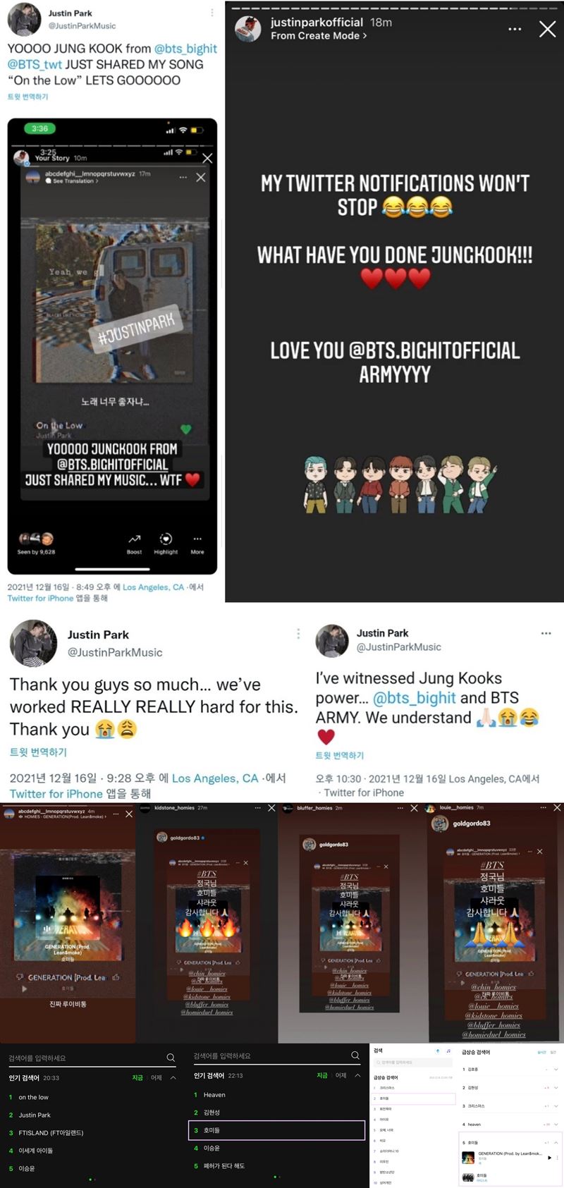 이에 원곡자 저스틴 파크는 자신의 SNS에 "정국이 나의 'On the Low'를 방금 공유했어"라고 감격하며 "정말 감사합니다... 우리는 정말 정말 열심히 노력했습니다. 감사합니다"라고 기쁨의 눈물을 감추지 못했다.