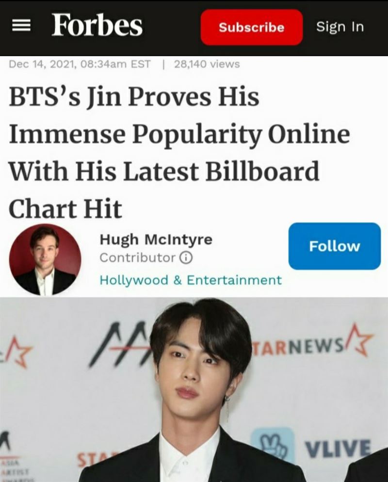 지난 16일 미국 매체인 올케이팝(allkpop)은 포브스가 '자신의 분야에서 가장 성공한 남성 아티스트'로 방탄소년단 진을 선정했다는 소식을 전했다. 매체는 “진이 자신의 이름으로 빛나는 기록을 세웠고 하나의 빌보드 랭킹에서 두 배의 업적으로 가장 성공적인 남성 아티스트가 되었다”라고 감탄했다. 진의 솔로 가수로서의 첫걸음이 전 세계 음악 산업에 얼마나 영향력이 있었는 지를 집중 조명한 것.