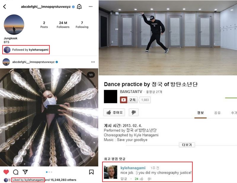 세계적인 안무가 카일 하나가미가 최근 방탄소년단 멤버 중 유일하게 정국의 개인 인스타그램 계정만을 팔로잉했다. 정국의 셀카 게시글에도 '좋아요'를 클릭하는 등 관심을 드러냈고 이에 최애 인증이 아니냐는 의견도 나타났다.