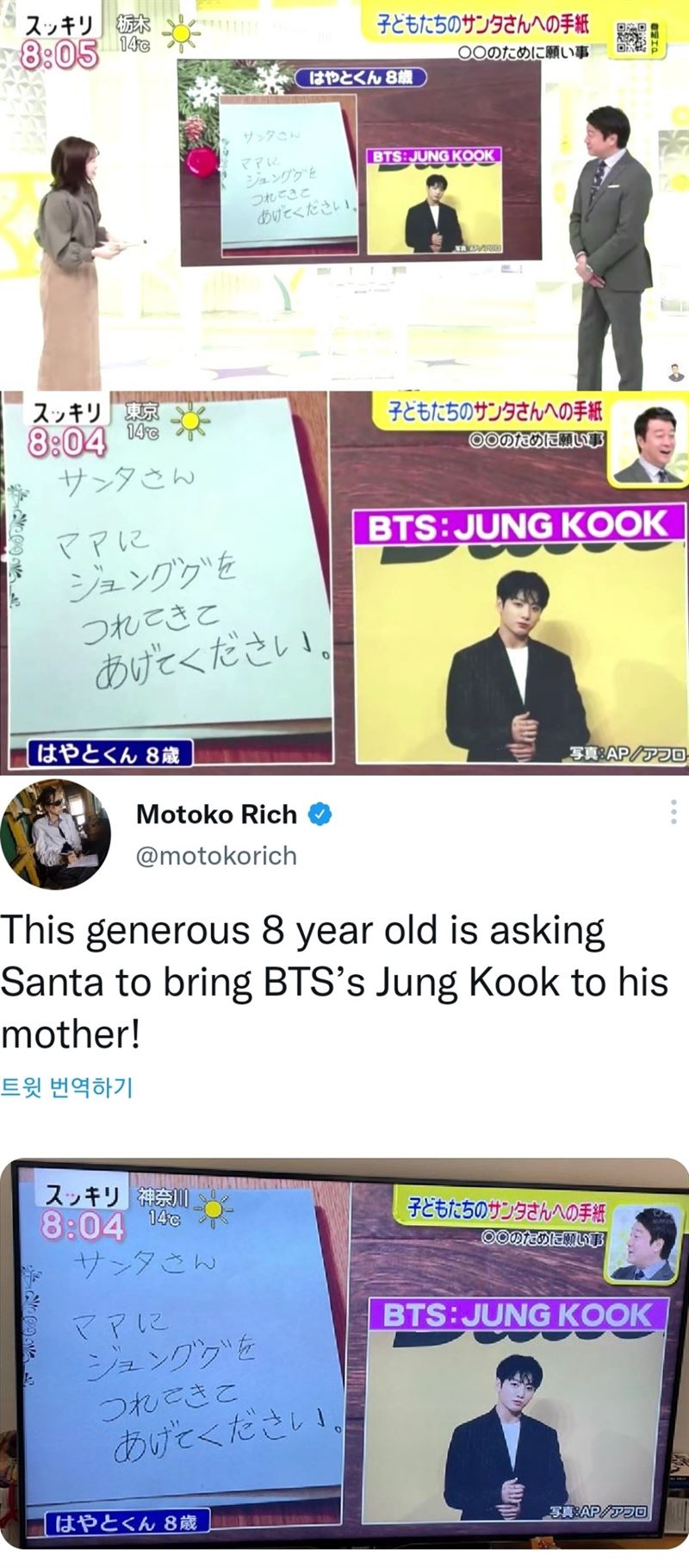 최근 일본 니혼TV 아침 프로그램 '슷키리'(スッキリ)에서 크리스마스를 앞두고 산타에게 바라는 소원이 담긴 편지가 소개됐다. 이 중 "산타 상, 우리 엄마에게 정국을 데려와 주세요"라고 산타에게 선물 대신 방탄소년단 정국을 소원으로 빈 8살 하야토 군의 편지가 화제다.