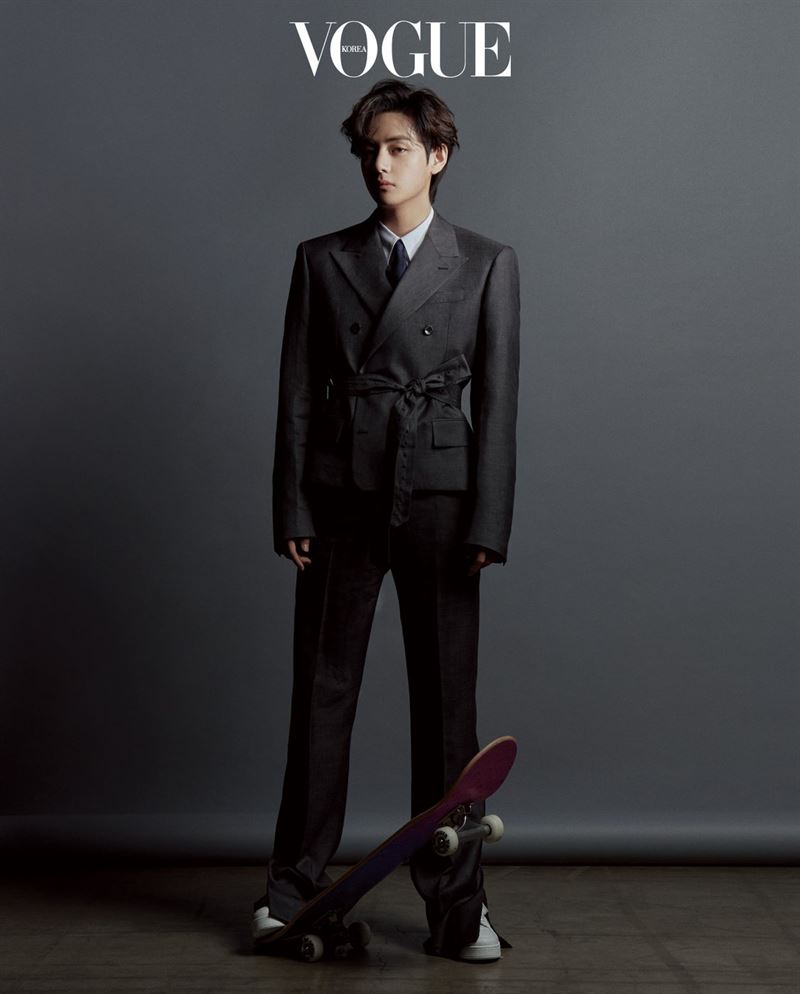 벨티드 다크그레이 슈트에 화이트 셔츠를 입은 사진에서는 세련된 도시미를 연출, 슈트의 정석을 과시했다. 뷔가 인스타그램에 게재한 V컷에는 슈트를 입고 독특한 선글라스와 백을 들고 있는 사진이 포함돼 눈길을 끌었다.
