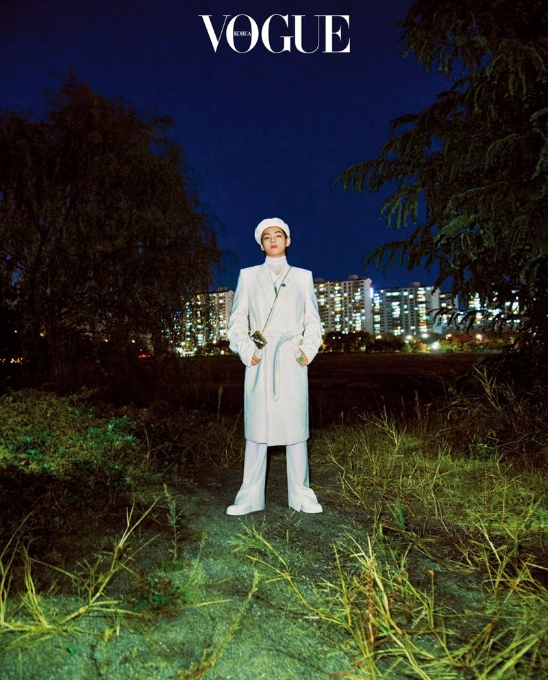불빛의 도시 풍경을 뒤로하고 코트, 슬랙스, 신발, 베레모 등 머리에서 발끝까지 모두 소화하기 힘든 화이트룩으로 연출한 뷔는 완벽한 비주얼과 비율로 남다른 아우라를 발산했다.