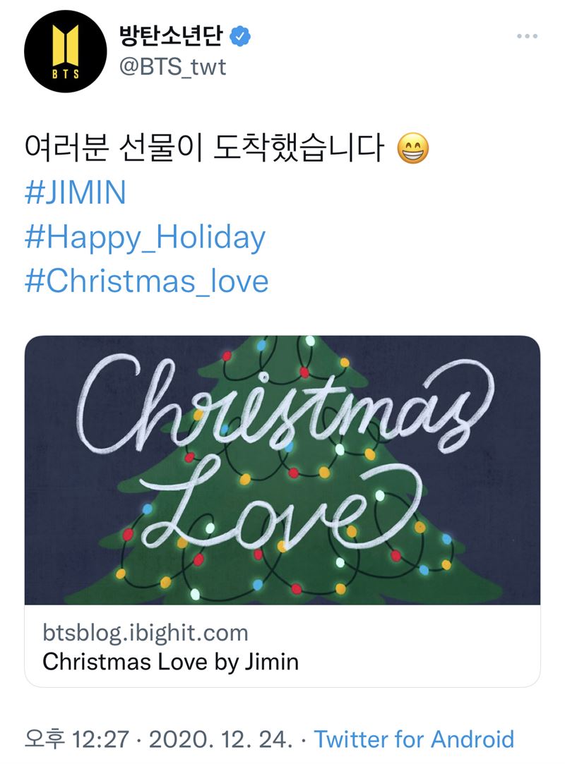 방탄소년단 지민의 자작곡 ‘크리스마스 러브’(Christmas Love) 1주년을 맞아 전세계 팬들의 축하 행렬이 이어졌다.