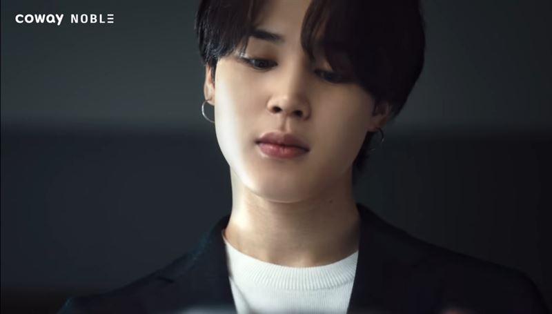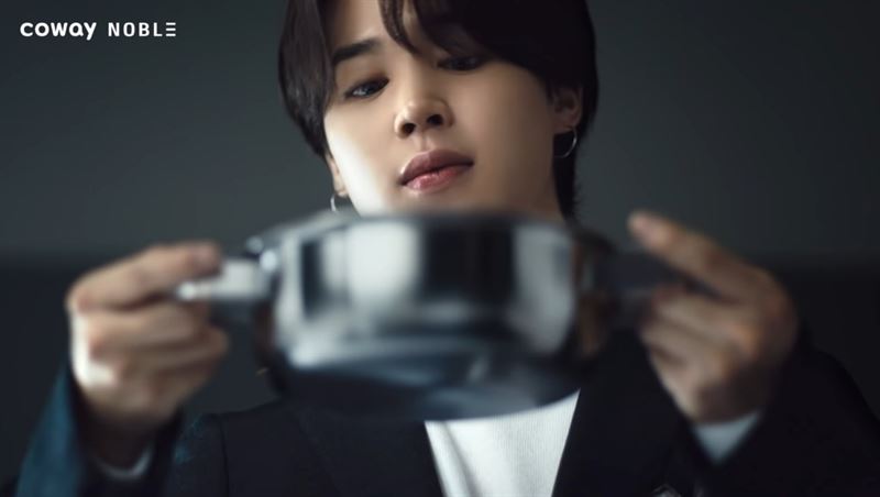 지민은 화이트 이너에 블랙 수트를 입은 댄디하고 고급스러운 본연의 이미지를 극대화해 코웨이 신제품의 프리미엄 가치를 한껏 끌어올렸다.