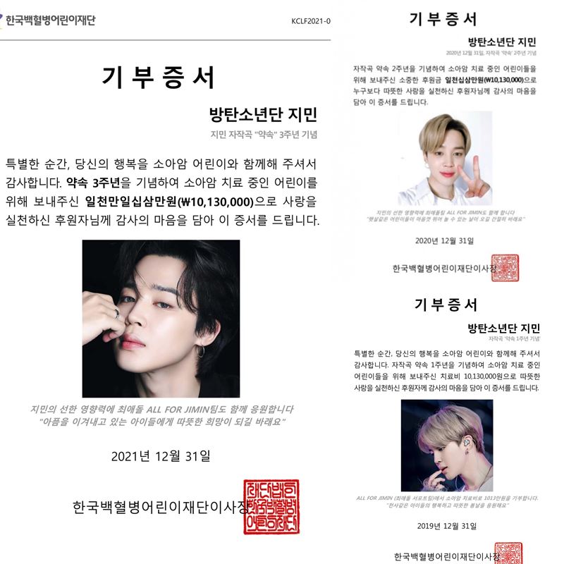 지난 27일 한국백혈병어린이재단은 공식 SNS 계정을 통해 “방탄소년단 지민의 팬베이스 'ALL FOR JIMIN'에서 지민의 자작곡 '약속' 3주년 기념으로 한국백혈병어린이재단에 1013만원을 기부했다”고 전했다. 이어 "아픔을 이겨내고 있는 아이들에게 따뜻한 희망이 되길 바라요"라며 소아암 치료비에 쓰일 것을 희망하는 메시지와 함께 기부 증서를 게재했다.