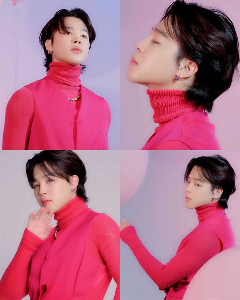 사랑스러운 분위기의 파스텔 핑크를 배경으로 풍선과 원형 구조물 사이에서 지민은 선명한 올핑크룩을 선보이며 단번에 시선을 집중시켰다. 탄탄한 팔 근육라인이 드러나는 하이넥 핑크 니트와 슬랙스, 여기에 베스트를 매치해 춤과 운동으로 다져진 라인의 잘록한 허리와 환상적인 바디핏으로 카메라를 가득 채웠다.