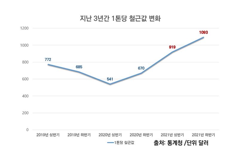 지난 3년간 1톤당 철근값 변화표 (그래픽=정지수 기자)