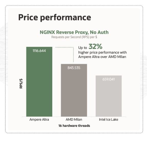 클라우드 플랫폼 전문기업 오라클은 arm 프로세서(Ampere Altra, 사진 왼쪽 초록색)가 타사 AMD, 인텔 등의 제품보다 가격 대비 성능이 우수하다고 소개하고 있다. (사진=오라클 홈페이지 갈무리)