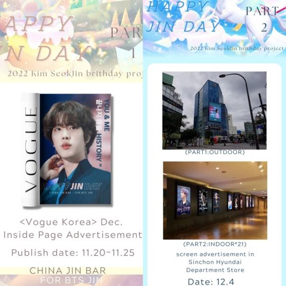 진의 중국 팬계정인 '차이나진바'(ChinaJinBar)는 진의 생일을 맞아 '보그 코리아' 12월호 인사이드 광고를 진행한다. 또 12월 4일 당일에는 신촌 현대백화점 유플렉스 옥외 벽면에 설치된 초대형 LED 전광판에 영상을 송출할 예정이며, 지하 연결통로에는 75인치 21개의 LCD 패널에도 진의 모습을 볼 수 있다.