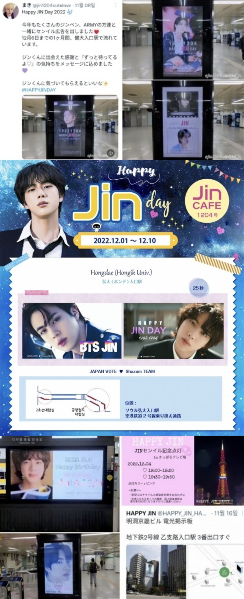 또 다른 팬계정인 '진카페(Jin CAFE)는 12월 1일부터 20일까지 홍대입구역 미디월 광고 영상을 송출하며 진의 생일을 축하한다. 다수의 일본팬들이 모여 진에게 행복을 전하고 싶다는 진카페는 특히 영상에 "석진이가 ‘다녀왔어’라고 말하는 날을 기다리고 있을게"라는 문구로 군 입대를 앞둔 진에게 사랑과 응원을 전했다.