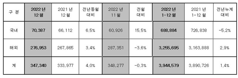 현대차 2022년 12월 및 1~12월 누적 판매 대수 (자료=현대차)