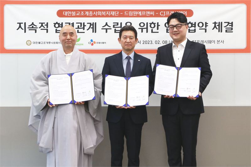 CJ프레시웨이가 대한불교조계종사회복지재단, 사회적기업 드림원에프앤씨와 3자 업무협약을 맺고 노인 무료 급식의 질 향상에 나선다.