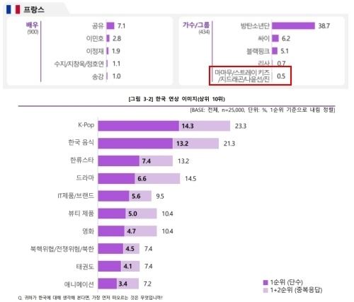 최근 문화체육관광부는 '2023 해외한류실태조사 결과 보고서'를 발표했다. 이에 따르면 해외에서 한국을 떠올릴 때 가장 먼저 생각하는 이미지는 K-POP으로 나타났다. 진이 속한 방탄소년단은 중국과 태국을 제외한 24개의 나라에서 1위를 차지했다.