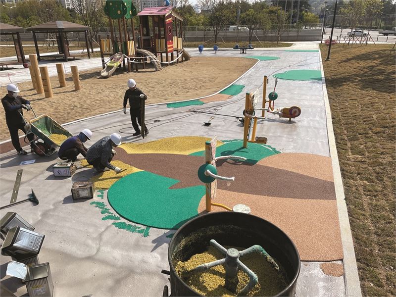 어린이놀이터 우레탄 작업에서 중소기업 인증자재 시공하는 모습. (사진=LH)