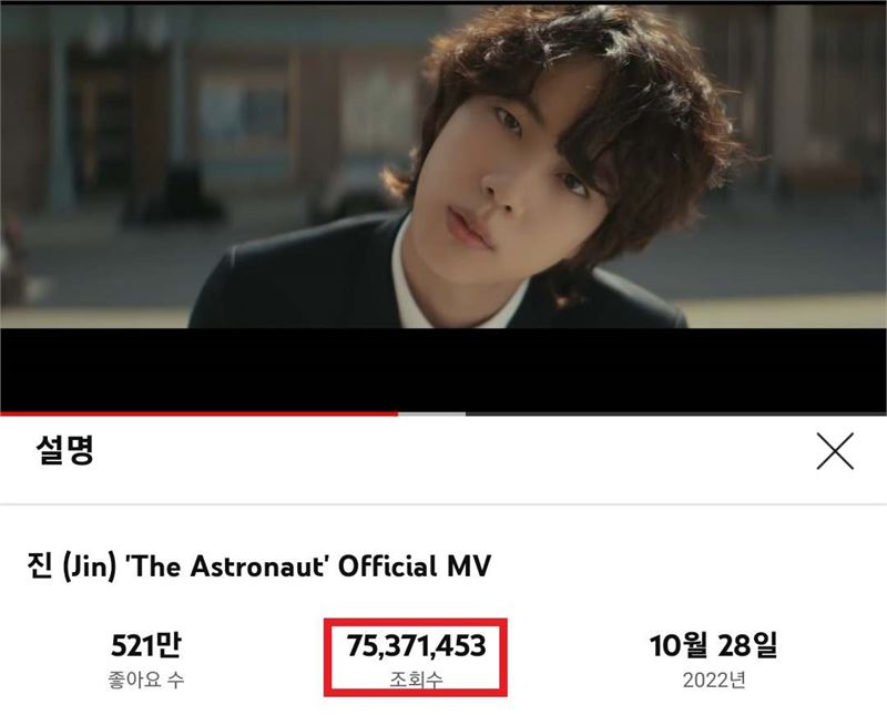 방탄소년단 진의 'The Astronaut'(디 애스트로넛) 뮤직비디오가 조회수 7500만 뷰를 돌파하며 실력파 보컬리스트의 면모를 과시했다.