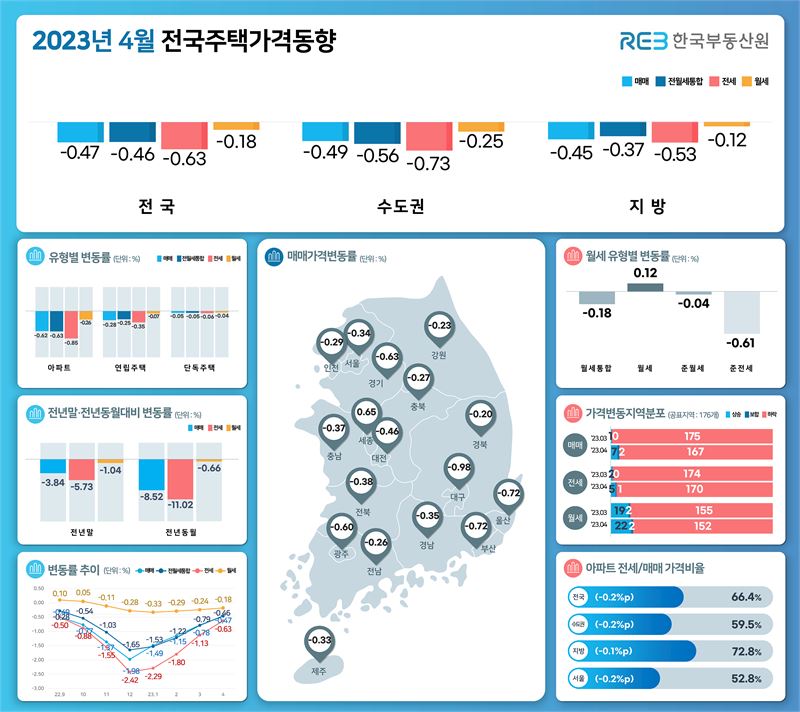 15일 한국부동산원이 발표한 '4월 전국 주택가격 동향조사'에 따르면 지난달 전국 월간 주택종합 매매가격은 0.47% 하락하면서 전월(0.78%↓) 대비 하락폭이 축소됐다.