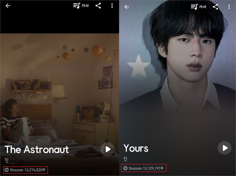 최근 진의 첫 솔로 싱글 '디 애스트로넛'(The Astronaut)은 K팝 역대 최초로 1500만 샤잠을 돌파했다. 종전 1위였던 진의 첫 솔로 OST '유어스'(Yours)를 제치고 K팝 역대 가장 많이 샤잠된 곡이 됐다. 이로써 진은 최다 샤잠된 K팝 1위, 2위에 오르는 영광을 차지했다.