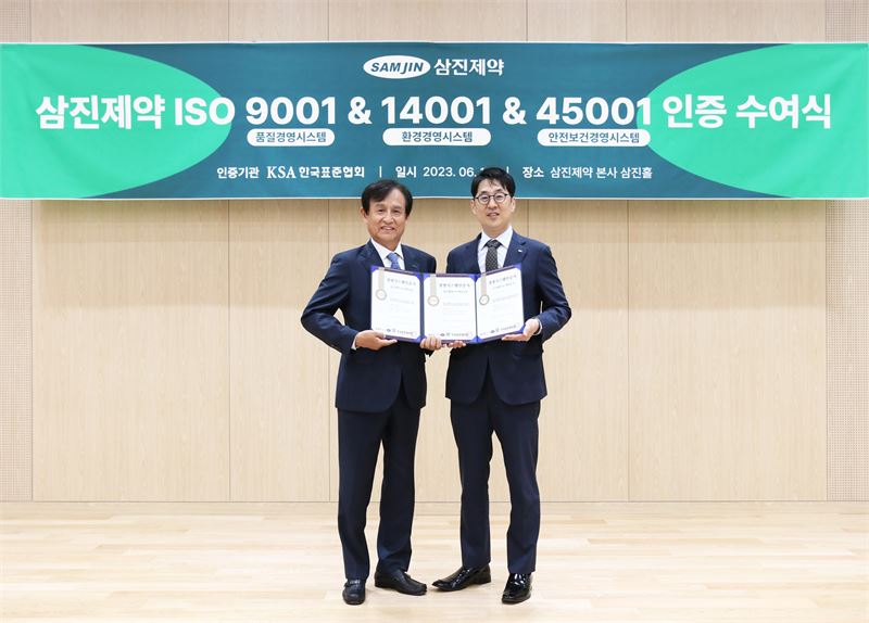 삼진제약이 이번에 취득한 인증 시스템은 국제표준인 ‘ISO9001, ISO14001, ISO45001’으로서 국제인증기관인 ‘KSA 한국표준협회 산업표준원 국제인증센터’의 심사를 통해 진행됐다.