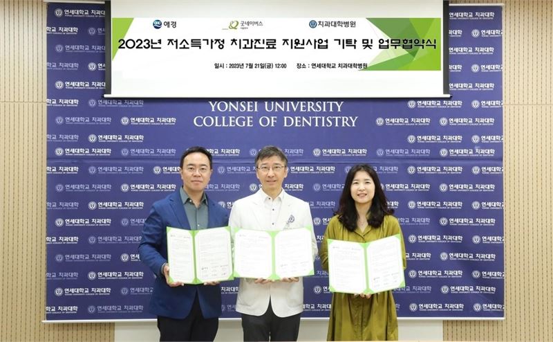 애경산업은 21일 연세대학교 치과대학병원, 굿네이버스 서울본부와 함께 저소득 가정 아동들을 위한 '치과진료 지원 사업 협약식'을 진행했다. 애경산업은 연세대 치과대학에서 진행된 협약식을 통해 3년간 치과 진료비 총 1500만원을 지원한다. 지원금은 서울시 내 저소득 가정 아동들의 구강검진, 충치치료 등에 사용된다.