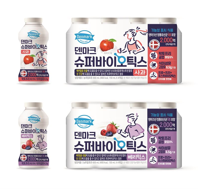 동원F&B가 덴마크산 정통 유산균을 함유한 ‘덴마크 슈퍼바이오틱스’ 2종(사과, 베리믹스)을 출시하고 기능성 발효유 시장 공략에 나섰다. ‘덴마크 슈퍼바이오틱스’는 세계적인 유산균 전문 기업 ‘크리스찬 한센(Chr. Hansen)’이 개발한 덴마크산 유산균 5종을 포함하고 있다. 한 병당 유산균 함량이 2000억 CFU에 달하며, 유당을 100% 제거하는 락토프리(Lactose-free) 공법으로 만들었다.