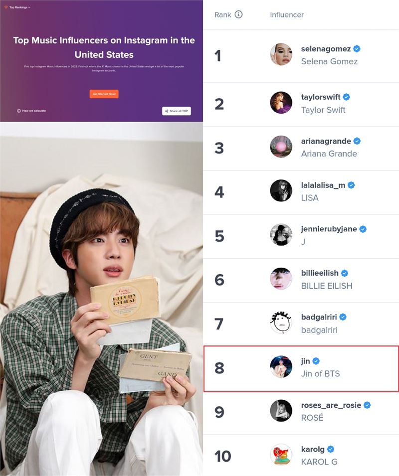 방탄소년단 멤버 중에서도 유일하게 해당 차트 TOP 50에 랭크인한 멤버인 진은 '미국에서 가장 영향력 있는 인플루언서 톱 1000' 랭킹에서도 202일간 아시아 남성 1위에 올랐다. 지난 6월 '미국에서 가장 영향력 있는 뮤직 인플루언서' 랭킹 전 세계 남성 1위를 차지하는 등 오랫동안 높은 순위를 차지, 각국의 슈퍼스타들이 모이는 미국에서도 극강의 인기와 파워를 보였다.