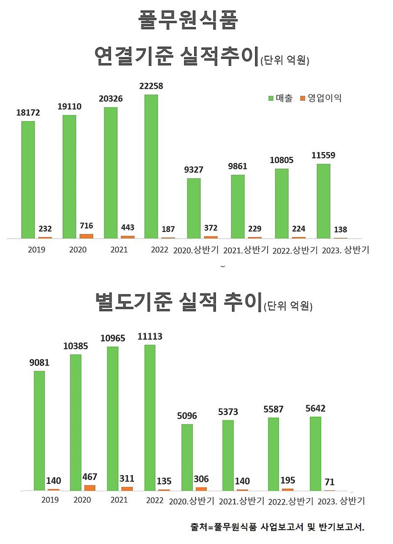 21일 금융감독원에 따르면 풀무원식품은 올해 상반기 연결기준 영업이익이 138억원을 기록하면서 지난해 상반기 224억원보다 38% 감소했다. 반면, 매출은 매년 증가하고 있다. 같은 기간 풀무원식품의 연결기준 매출은 1조1559억원으로 2020년 9327억원을 보인 이후 매년 성장세를 멈추지 않는 중이다.