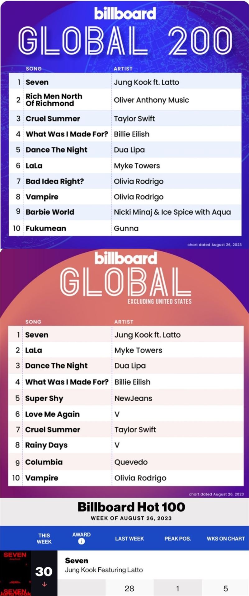 미국 저명한 음악 전문 매체 빌보드가 발표한 최신 차트(8월 26일 자)에 따르면, 정국의 솔로 싱글 'Seven'(세븐)이 '글로벌200'과 '글로벌(미국 제외)'에서 지난주에 이어 또 한번 1위를 차지했다. 이로써 'Seven'은 해당 2개 차트에서 '5주 연속' 최정상의 자리를 장악하며 장기 집권을 이어갔다.