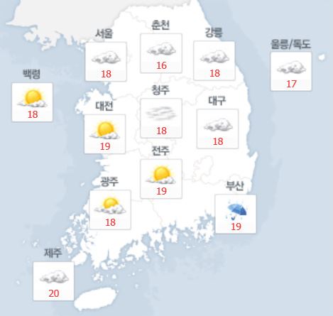 오전 9시 기준 현재 기온은 서울 17도, 춘천 15도, 강릉 16도, 대전 17도, 대구 17도, 광주 17도, 부산 19도, 제주 20도 등을 보이고 있다.