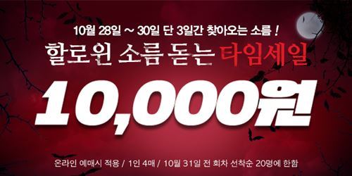 ?인터파크티켓을 통해 진행되는 이벤트는 10월 28일부터 30일까지 할로윈데이 당일 공연을 선착순 20명에게 1만원에 구매할 수 있는 기회를 제공한다.