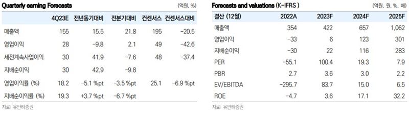 이후 실적 전망 역시 긍정적이다. 보고서에 따르면 2024년/2025년 각각 연간 예상 영업이익은 123억원(OPM 19%, YoY 1827%), 301억원(OPM 28%, YoY 145%)으로 사상 최대 실적을 예상했다. 그는 "Overlay 장비 라인업 다변화, 국내 H사를 포함한 메모리반도체 선단공정 중심의 전공정 투자 회복 및 해외(중국/일본) 고객 다변화, Wafer Thickness 양산 장비 납품 개시 등이 실적 성장의 배경"이라고 전했다.