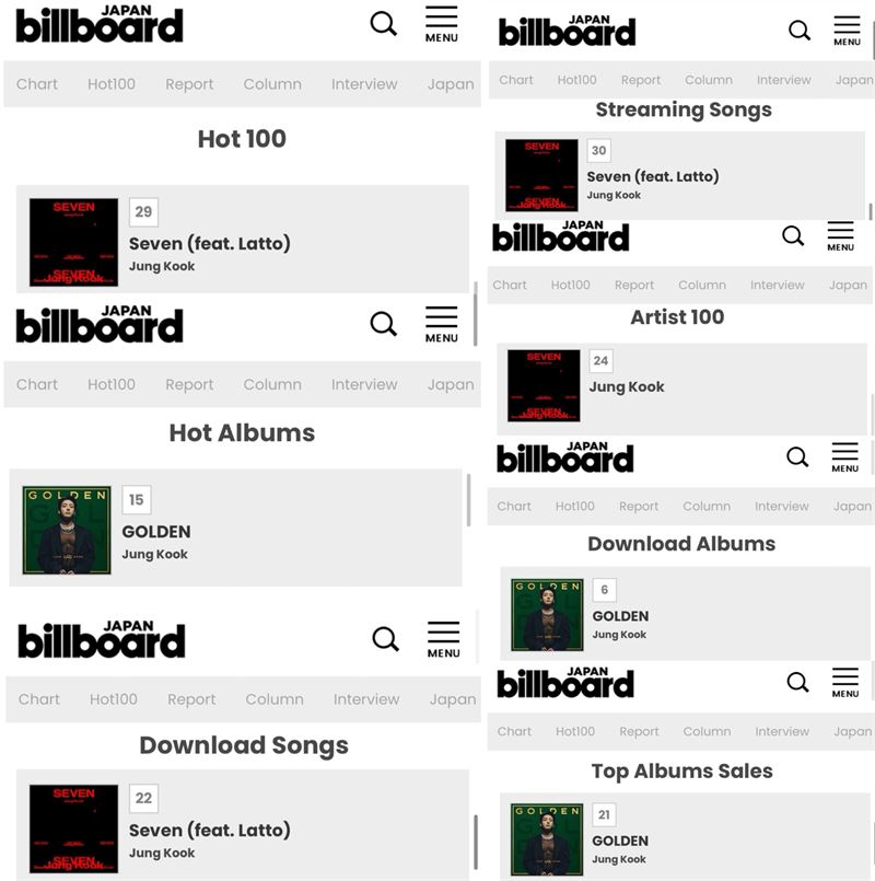 빌보드 재팬이 발표한 2023년 연간 차트에 따르면, 정국의 첫 솔로 앨범 'GOLDEN'(골든)이 종합 앨범 차트인 '핫 앨범' 차트 15위를 비롯해 '다운로드 앨범' 차트 6위, '톱 앨범 세일즈' 차트 21위를 차지했다. 정국의 솔로 싱글 'Seven'(세븐)은 종합 노래 차트인 '핫 100'에서 29위에 올랐고 '스트리밍 송' 차트 30위, '다운로드 송' 차트 22위에 랭크됐다.
