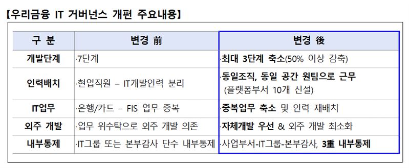 우리금융은 IT 운영방식을 '그룹사 간 위수탁 방식'에서 '그룹사 직접 수행방식'으로 최근 전환을 완료했다. 기존 IT 자회사인 우리FIS 위탁 수행에서 우리은행·우리카드 직접 수행 방식으로 개편한 것.
