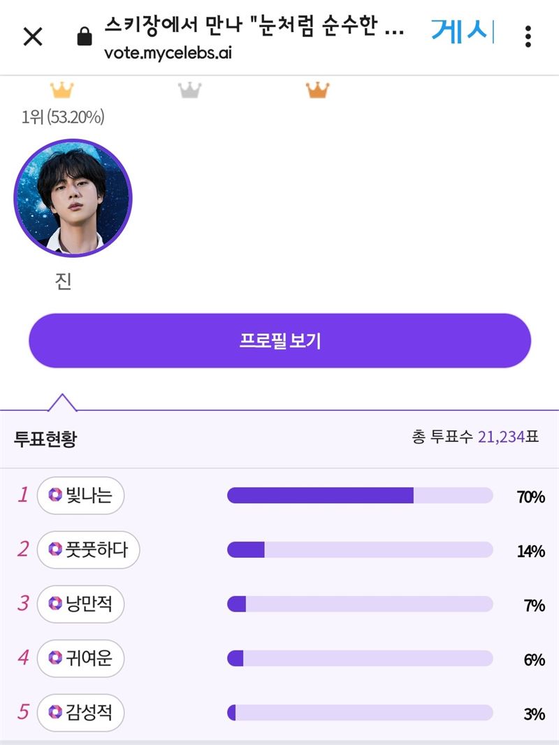 최근 익사이팅 디시는 '스키장에서 만나 “눈처럼 순수한 사랑”을 하고 싶은 남자 아이돌은?' 설문을 진행했다. 그 결과 진이 3만 9910표 중 2만 1234표를 획득해 53.20%의 월등한 득표율로 1위를 차지했다.