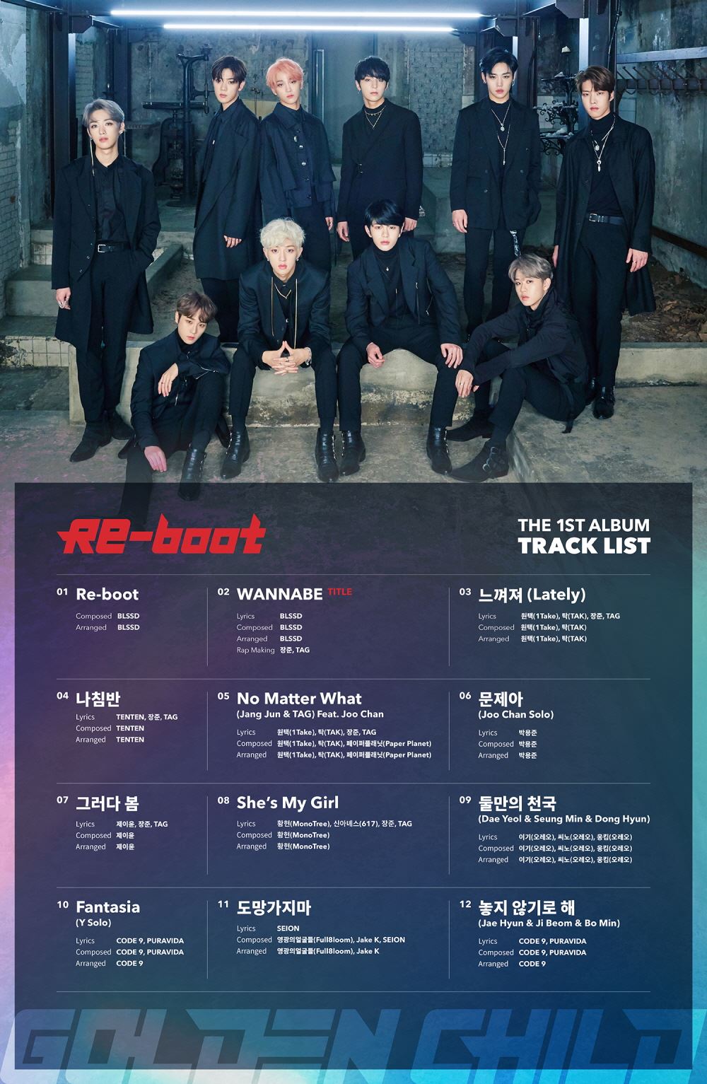 공개된 트랙 리스트에는 슈트 차림의 시크한 남성미를 자랑하는 열 명의 골든차일드 멤버들의 모습과 함께 타이틀곡 ‘워너비(WANNABE)’를 포함해 ‘리부트(Re-boot)’, ‘느껴져(Lately)’, ‘나침반’, ‘문제아’ 등 총 12트랙이 공개됐다.