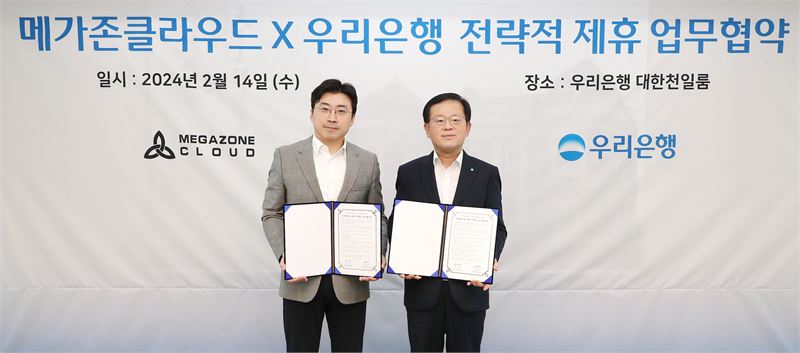 우리은행(은행장 조병규)은 지난 14일 클라우드 관리 전문기업인 메가존클라우드(대표이사 이주완)와 ‘BaaS 구체화 및 공동 협력을 위한 전략적 업무협약’을 체결했다고 15일 밝혔다.