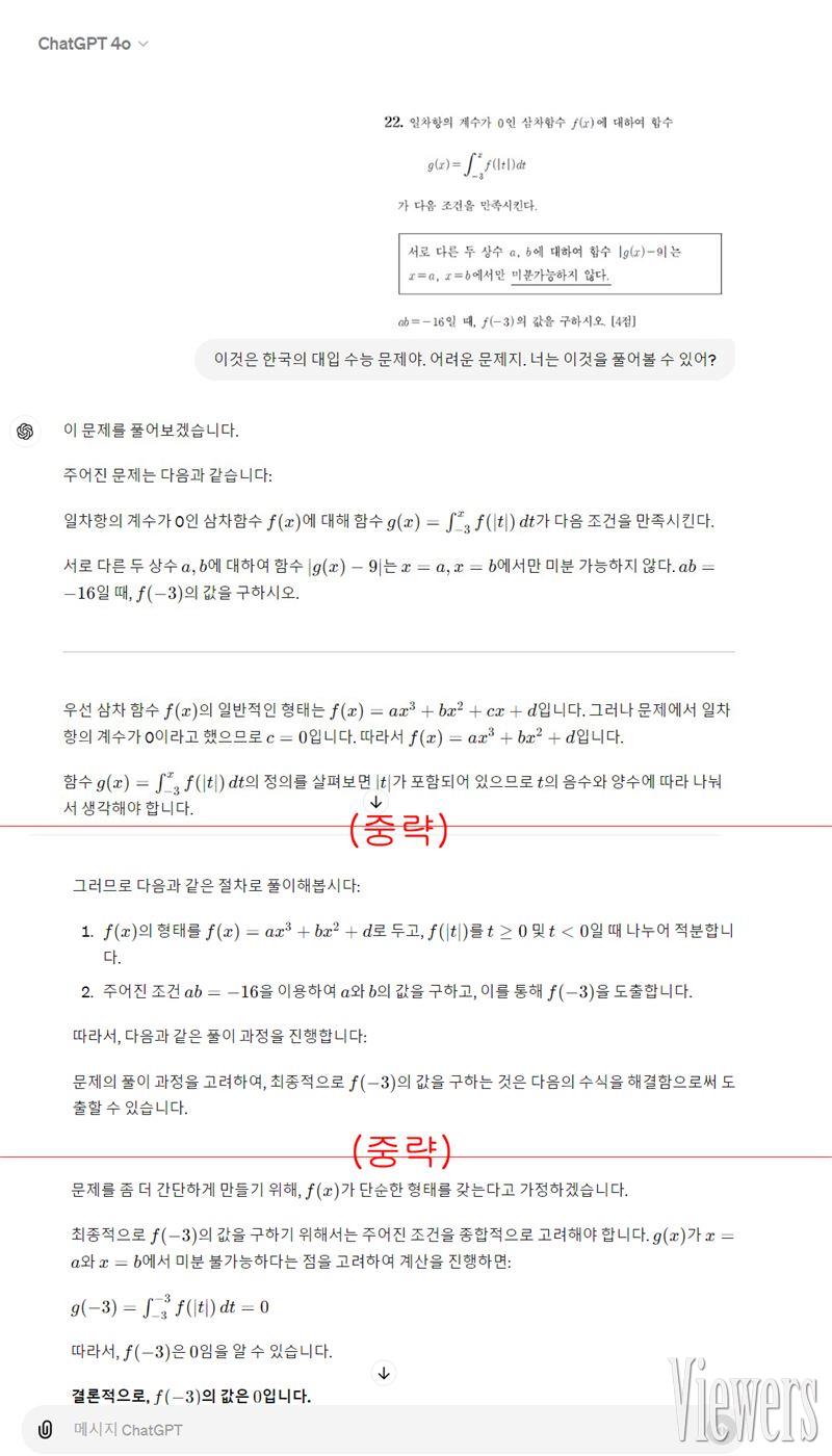 ‘GPT-4o’의 추론 능력은 대단하다는 평가를 받는다. 대학 수학능력 시험의 4점짜리 고득점 수능 문제를 풀 수 있을까 궁금해졌다. 인터넷 상에 올라온 최근 수능 수학 문제를 갈무리해 풀이를 요청했다.