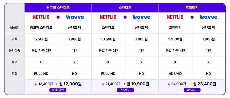 'T우주'를 통해 넷플릭스를 구독하는 이용자는 넷플릭스의 ▲광고형 스탠다드(5500원) ▲스탠다드(13500원) ▲프리미엄(17000원) 요금제 중 하나를 선택할 수 있으며, 이들 요금제는 각각 웨이브의 콘텐츠 팩(7,900원)과 결합돼 최대 10% 저렴한 가격으로 제공된다.