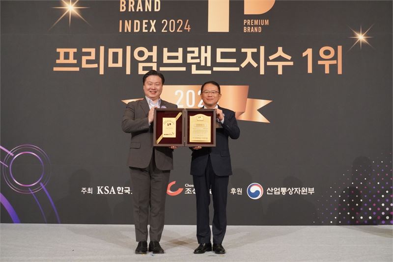 형지엘리트가 ‘2024 프리미엄브랜드지수(KS-PBI)’ 학생복 부문 1위에 올랐다. 사진은 지난 18일 열린 시상식에서 최준호 형지엘리트 부회장(좌)이 상을 수상한 뒤 강명수 한국표준협회장(우)과 상패를 들고 포즈를 취하고 있다. 사진=형지엘리트.