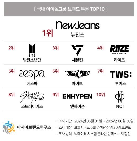 K-브랜드지수 아이돌그룹 부문은 뉴진스가 1위의 영예를 차지한 가운데 방탄소년단(2위), 세븐틴(3위), 라이즈(4위), 에스파(5위), 아이브(6위), 투어스(7위), 스트레이키즈(8위), 엔하이픈(9위), NCT(10위) 등이 TOP10에 이름을 올렸다.