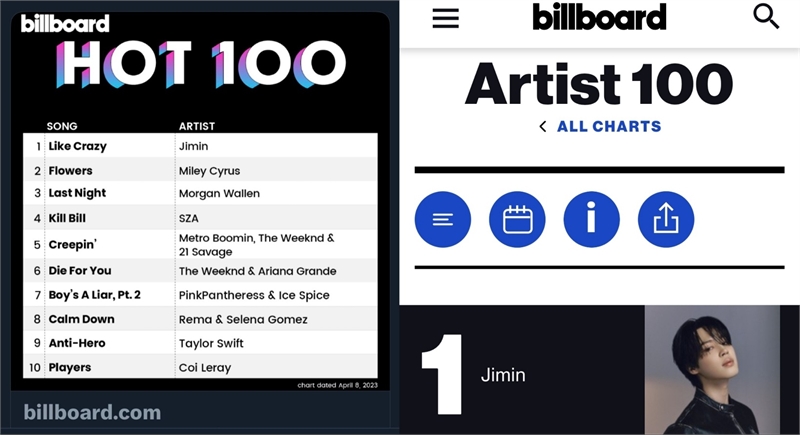 1위에 오른 K팝 아티스트 9팀 중 솔로 아티스트로는 지민이 유일하다. 지민은 지난해 데뷔 10년만에 발표한 첫 솔로 앨범 '페이스'(FACE) 타이틀곡 '라이크 크레이지'(Like Crazy) 빌보드 '핫100' 1위를 기록하며 이와 동시 K팝 솔로 최초 '빌보드 아티스트 100' 1위에 올랐다.