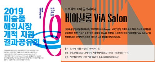 문화체육관광부(장관 박양우)와 (재)예술경영지원센터(대표 김도일)는 변화하는 미술시장에 발맞춰 ‘해외 아트페어 참가 지원’(PIAF) ‘해외 기획전시 지원’(FKAA) ‘프로젝트 비아’(Project ViA)의 결과 공유회를 12월 13일 서울 중구 서울시립미술관 세마홀과 18일 서울 종로구 공공그라운드 001스테이지에서 연다.