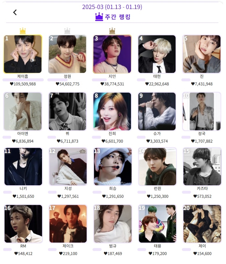 제이홉은 글로벌 K팝 아이돌 인기투표 '케이돌'의 2025년 1월 3주차 주간 랭킹에서 1억 950만 9988 하트를 기록하며 우승했다. 2위는 5460만 2775 하트를 받은 엔하이픈 정원, 3위는 3877만 4531 하트를 얻은 BTS 지민이 각각 차지했다. 투모로우바이투게더 태현과 BTS 진은 각각 2296만 2648 하트와 743만 1948 하트로 4위와 5위에 이름을 올렸다.