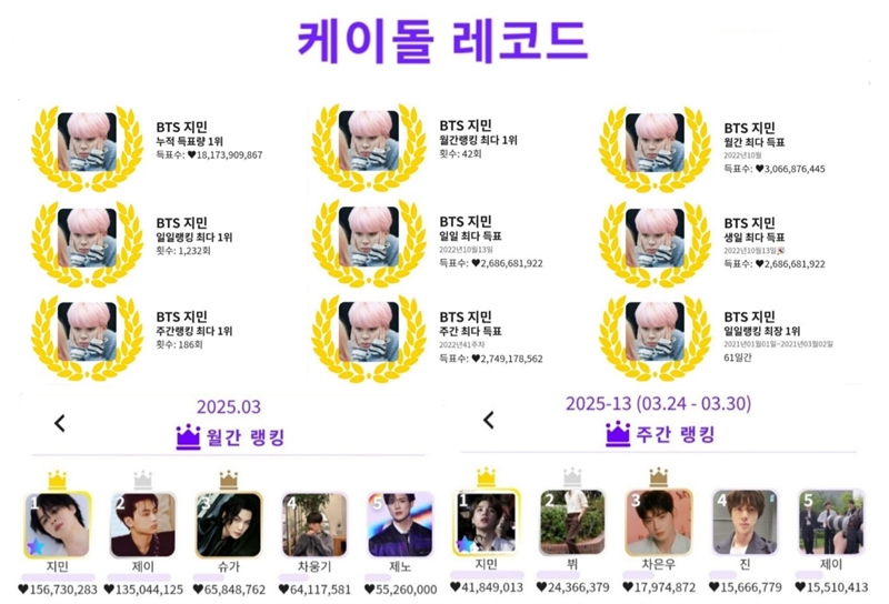 지민은 현재 누적 득표수 181억 7390만 9867표를 기록하며 2위와 압도적인 차이로 케이돌 명예의 전당 1위를 굳건히 지키고 있다. 또 케이돌 레코드 '일일랭킹 최장 1위' 부문에서도 1232회 1위를 기록했다.