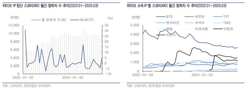 그는 "주력 IP인 BTS의 글로벌 인지도 정점은 지났을 지 모르나 코로나와 군백기 동안 공연 티켓 가격 상승 및 확장된 글로벌 투어 시장(중국 한한령 해제)을 고려하면 2026년 실적 기여분은 역대 최대치일 것"이라며 "코로나 이후 데뷔한 저 연차 IP의 탈 아시아급 음원 지표 트랜드 역시 내년도 실적 레버리지로 두드러질 공산이 큰 상황"이라고 강조했다.