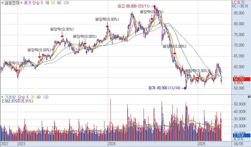 송명섭 애널리스트는 "이에 더해 트럼프 정부의 고관세 부과가 향후 경기를 일반적인 둔화 정도에 그치지 않고 경제 위기 상황으로까지 몰고갈 가능성도 있다"며 "향후 상황이 일반적인 경기 둔화에 그칠 것인지 아니면 경제 위기까지 갈지에 따라 향후 삼성전자의 최저점은 달라질 것"이라고 판단했다.
