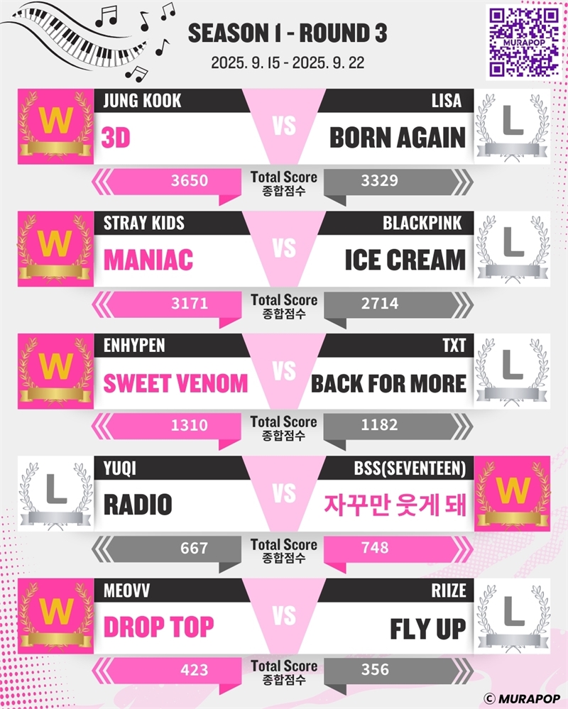 최근 글로벌 K-POP 매치 플랫폼 뮤라팝(MURAPOP)이 시즌 1-3회차 뮤직비디오 라이벌매치 결과를 공개했다. 결과는 매치 기간 동안 집계된 유튜브 공식 뮤직비디오 조회수와 뮤라 앱에서 진행된 글로벌 팬 투표수를 합산해 산정했다.