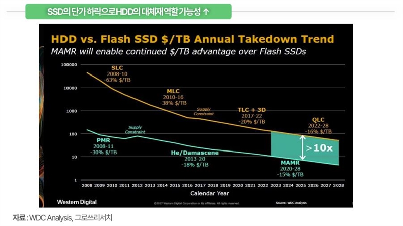 이번 실적 반등의 시작점은 낸드 기반 MCP 제품의 수주 증가다. 지난 몇 년간 정체 상태였던 MCP 사업은 2025년 2분기부터 본격적인 수주 회복세에 들어섰고, 그 중심에는 낸드 수요의 반등이 있다. AI 확산과 함께 대용량 서버 저장장치에 대한 수요가 급증하면서 기존 HDD를 대체하는 QLC SSD 수요가 확대됐다. HDD 업체들의 구조조정 여파로 리드타임이 52주를 초과하자, 가격 경쟁력을 앞세운 QLC SSD가 시장을 빠르게 대체하고 있는 상황이다.