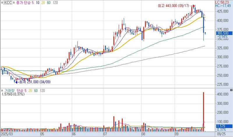 만약 이 같은 해석이 맞다면 KCC의 발표는 밸류업 이후 코리아 디스카운트를 벗어나기 위한 정부 맟 자본시장 움직임과 반대되는 행보다. 이에 전일 KCC 주가는 11.75% 급락한 36만7500원에 마감했다.