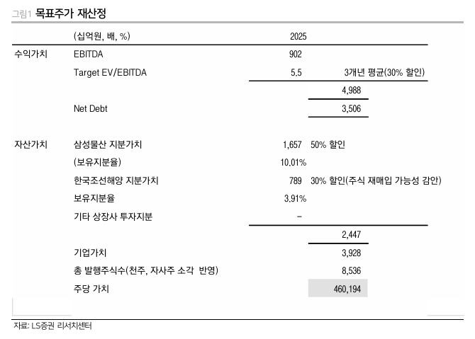 LS증권은 25일 보고서를 통해 "KCC에 대한 기관투자자들의 주된 요청 사항은 오래된(2012년 매입) 삼성물산 주식(9/24 종가 기준 3.3조원)의 유동화였다"면서 목표주가를 종전 52만4000원에서 46만원으로 떨어뜨렸다.